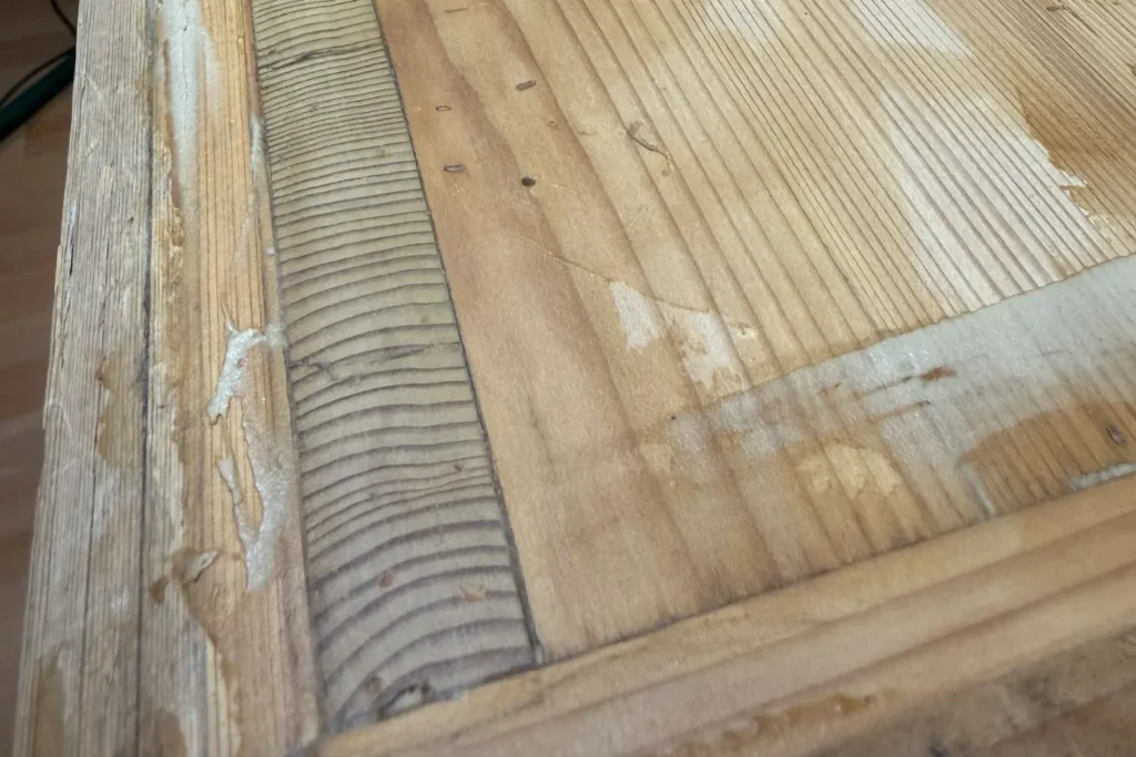 Risse wurden mit Wachs gestopft, kleine Löcher mit irgendetwas verfüllt, das gerade da war. Wenn du solch ein Möbelstück restaurierst, beginnt alles damit, altes und loses Material vollständig zu entfernen und die frühere Oberflächenbehandlung – also Lacke, Lasuren oder Wachs – abzutragen.