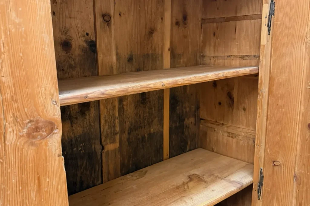 Viele kleine Gebrauchsspuren zeigen, dass der Schrank über Jahrzehnte tatsächlich genutzt wurde. Die Tür wurde oft geöffnet, die Kanten hatten Kontakt mit Gegenständen, Oberflächen wurden beansprucht. Diese Spuren wirken heute charaktervoll und geben dem Möbelstück seine Authentizität.