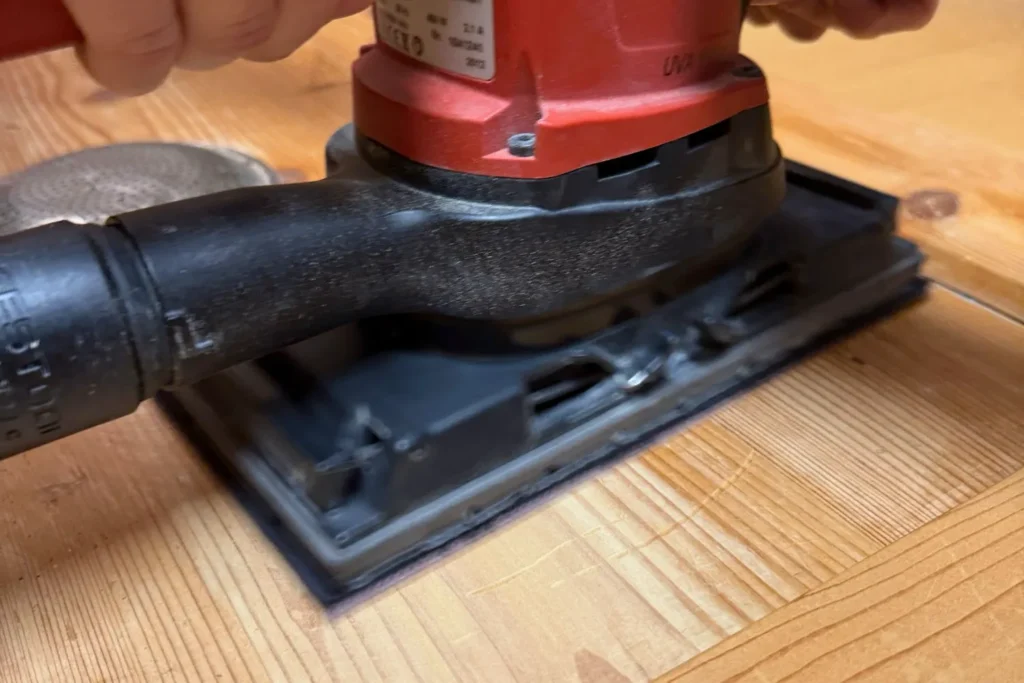 Im ersten Schritt haben wir die Oberfläche mit dem Schwingschleifer und einer 60er Körnung abgeschliffen – also bewusst recht grob, um die alte Schicht wirklich zu öffnen und das Holz wieder freizulegen.
