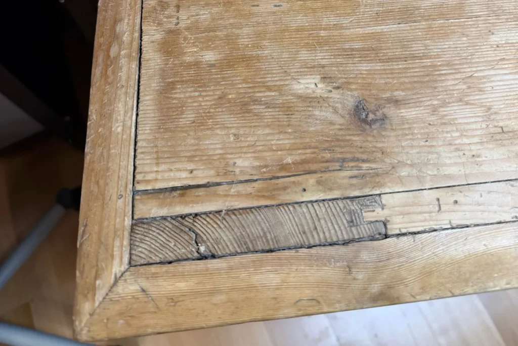 Nach dem ersten Schleifgang wurden weitere feine Risse und Fugen sichtbar – bei alten Möbeln vollkommen normal. Es gibt verschiedene Möglichkeiten, solche Stellen zu schließen, etwa mit Holzspachtel, Reparaturkitt oder Hartwachs (darüber wird in Fachforen ausgiebig diskutiert). Wir wollten jedoch eine schlichte und stimmige Lösung, die farblich genau zum Original passt und das Holz nicht verfremdet. Deshalb haben wir uns entschieden, die Fehlstellen mit einer Mischung aus Holzmehl und Holzleim aus dem Material selbst auszubessern.