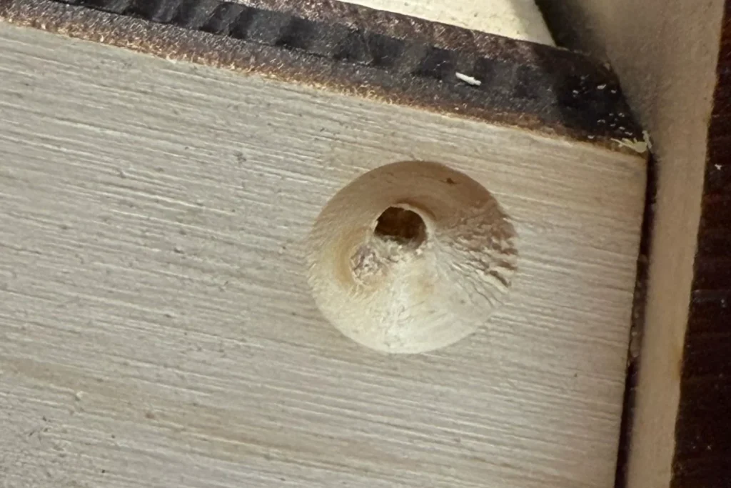 Lege beim Bohren ein Restbrett unter die Front und presse es gut an. So reißt das Holz auf der Unterseite nicht aus, wenn der Bohrer durchbricht.