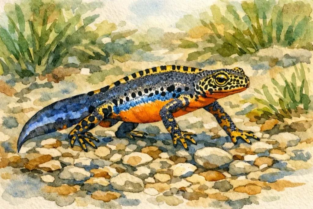 Der Bergmolch fällt sofort durch seine Farben auf: eine bunt schimmernde Oberseite und ein rötlich-orangefarbener, ungepunkteter Bauch. Zur Paarungszeit tragen die Männchen ein echtes „Hochzeitskleid“ – mit leuchtend blauer Rückenfärbung und einem gelb-schwarz gepunkteten Kamm. Die Weibchen wirken dagegen dezenter und sind meist grünlich-braun marmoriert. Bergmolche lieben Gewässer in mittelgebirgigen Wäldern und kommen in Deutschland vor allem im Süden vor, wo sie klare, sauerstoffreiche Teiche und Tümpel besiedeln.